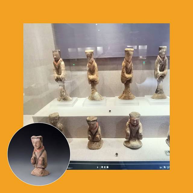 4、彩绘跽坐俑‖西汉。垂首、跽坐姿、双臂屈肘前伸,头戴巾帻、黑带结于颌下、施白色陶衣,黑绘长眉、细眼、八字胡、朱绘双唇,彩绘鲜艳、造型生动,泥质灰陶模制。