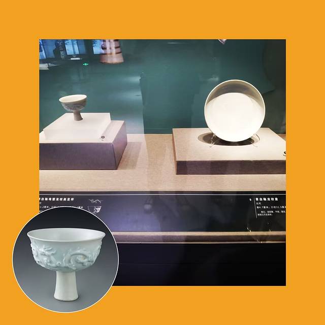 6、卵白釉堆塑龙纹高足杯‖元代。尖圆唇、深曲腹、上腹较直、下腹斜收,喇叭状高圈足中空,白胎胎质细腻轻薄、釉色光亮白中闪青,外壁贴塑双龙戏珠纹,立体感较强。