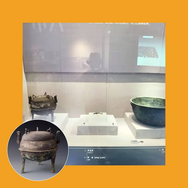 3、铜鼎‖战国。子口、圆腹、圜底、素面、三蹄足,腹置镂空长方耳、腹中部有一周凸棱,覆盘形盖、上立三环形钮。