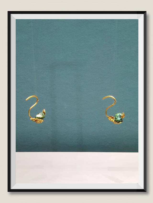 5、绿松石金耳坠‖元代。耳坠分为金饰和绿松石两部分,托座为金饰牡丹花叶,采用捶揲工艺制成,下端做成盘绕花蔓,镶嵌一颗绿松石,花叶上有细长阴线纹,上下以一根金针贯穿,绿松石形状不规则。