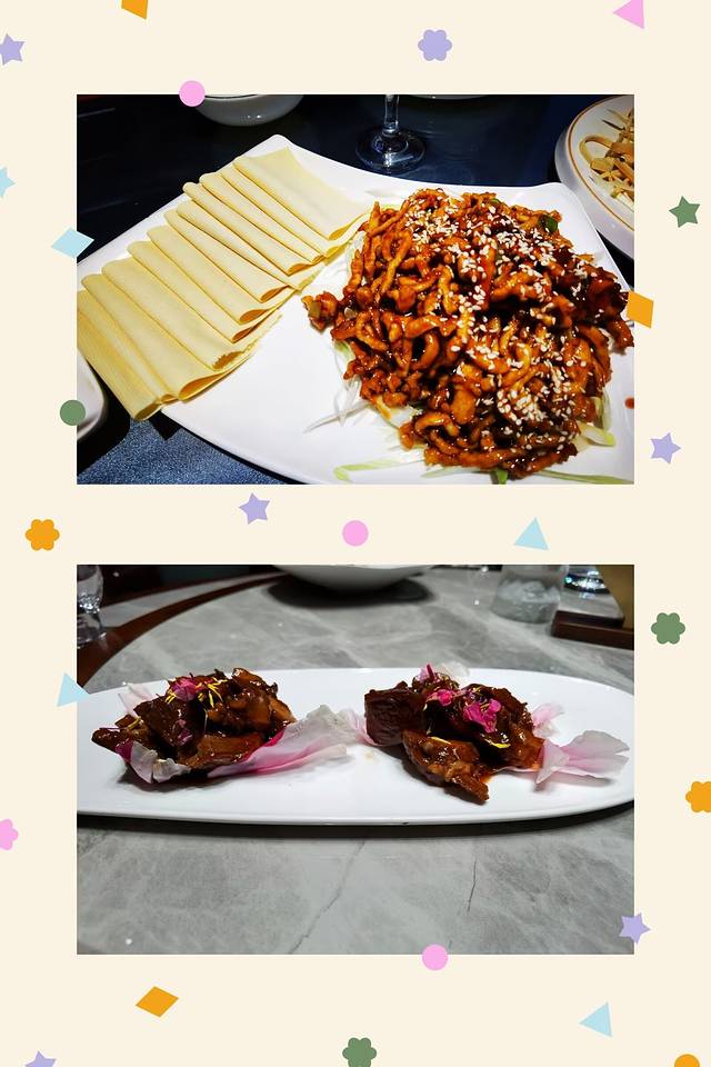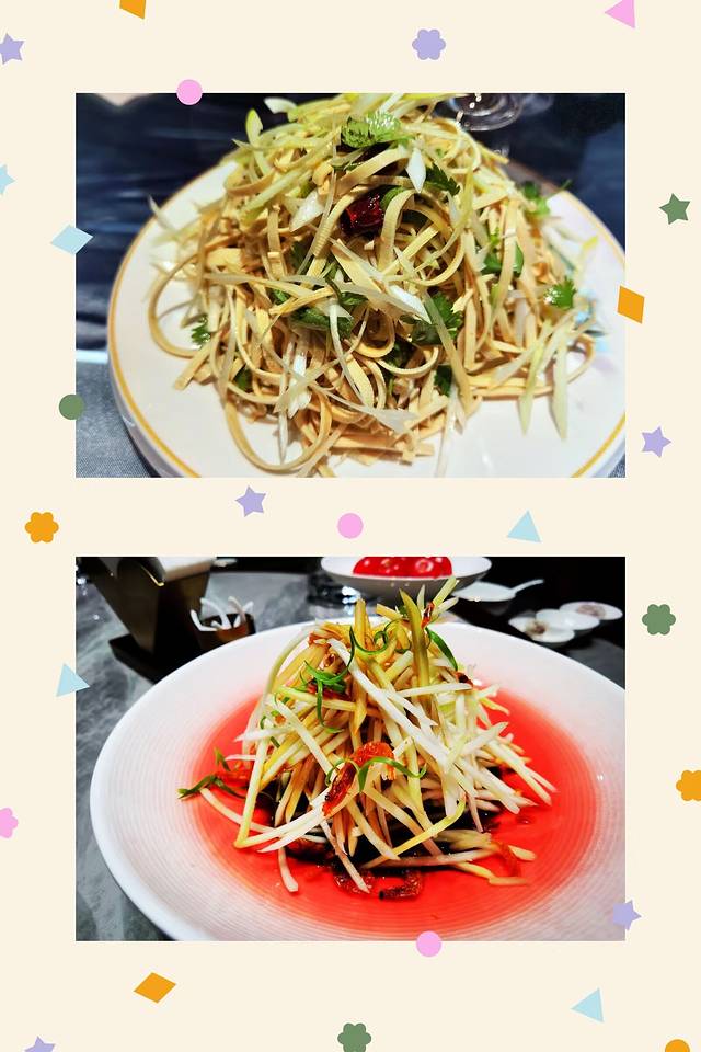3、菜肴种草。我们在这两家馆子吃过的菜肴中,种草8道我们觉得很有地方特色、味道较为独特的菜肴,山东菜馆:凉拌千张、九转大肠、京酱肉丝和炸鸡塔,语石雅宴:凉拌芥兰、蹄筋烩海参、蜜汁酱烧小牛肉和小米牡丹花鲍鱼盅;两者比较,前者较为重口味、带甜口,后者较为清淡、较精致。