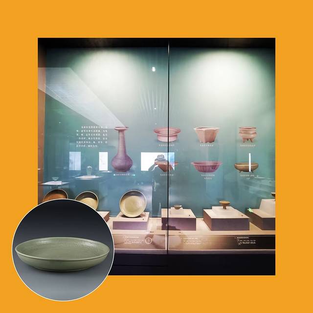 8、龙泉窑青釉杂宝纹盘‖元代。敞口、曲腹、矮圈足、下腹斜收,灰胎胎质较细、釉层较厚,内底心模印十字宝杵纹,外围模印一圈八宝纹。