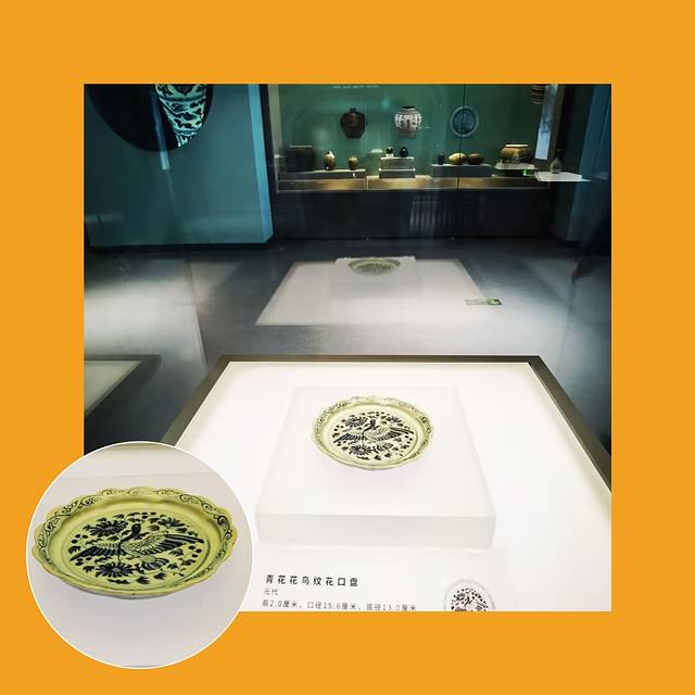 3、青花花鸟纹花口盘‖元代。平底、尖圆唇、斜直腹,白釉泛青、胎体细腻,内壁口沿处有一圈卷草纹,内底饰花鸟纹。