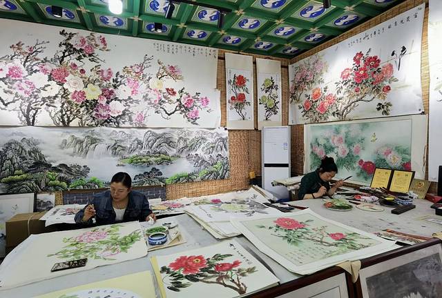 观花楼二楼正在展出曹州牡丹园书画院院长陈晓鸿的牡丹画展,陈晓鸿和另一位女画家还现场作画,吸引了很多人的眼光。