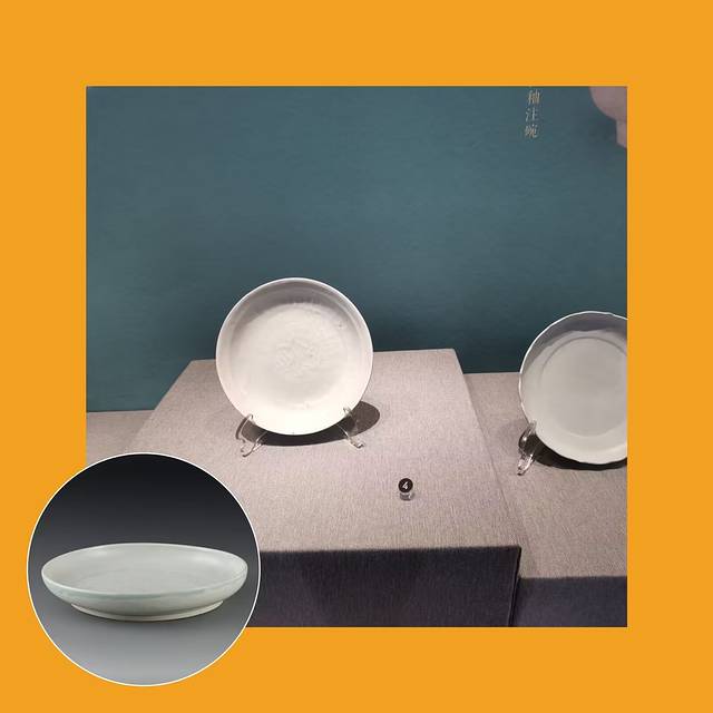 7、龙泉窑青釉印牡丹纹盘‖元代。敞口、圆唇、圈足、曲腹,白胎胎质较为厚腻,内底刻有划云龙纹,龙身细长弯曲,祥云围绕。