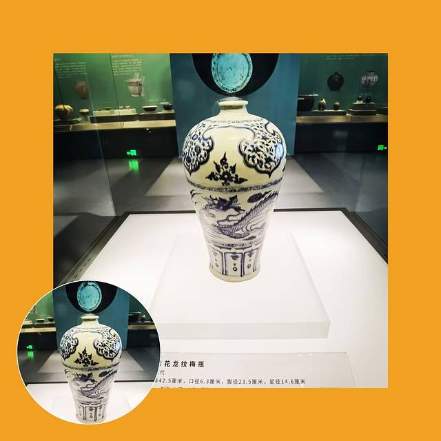 1、青花龙纹梅瓶‖元代。小口、圆唇、束颈、丰肩、平底、腹瘦长,胎体厚重、釉色温润,通体青花装饰、青花发色浓艳,这样的元青花梅瓶在整个山东省仅此1件,据说此瓶的市场拍卖价格可达2亿元人民币以上,此瓶为博物馆镇馆之宝。