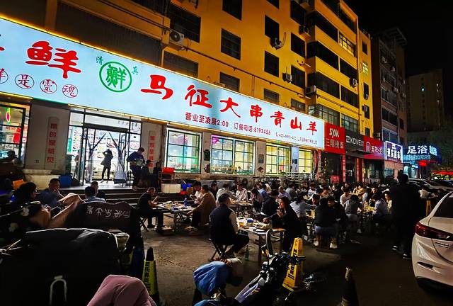 2、马征大串青山羊。这家店位于菏泽迎宾街上,就在山东菜馆(香格里拉店)的隔壁。那天,我们在山东菜馆酒足饭饱后出来,看到这家店门前座无虚席这一幕,让我们傻眼了,人咋比山东菜馆还多!于是过去拍照,不经意间与站位处的一桌哥们姐们搭上话了,这桌哥们姐们发出友好邀请:“兄弟!坐下来弄几杯。”无奈下一个节目已有安排,婉拒之余,也送上了邀请:“我们明晚来这里吃,兄弟姐妹们请一起过来,咱们聚聚啊!”这帮哥们姐们爽快地回应“好!”于是第二天有了一场与新结识的菏泽人的撸串小聚,微信好友又添加了新的朋友。我们邀约的,理应我们买单,结果被他们抢单了,这让我们情何以堪那!