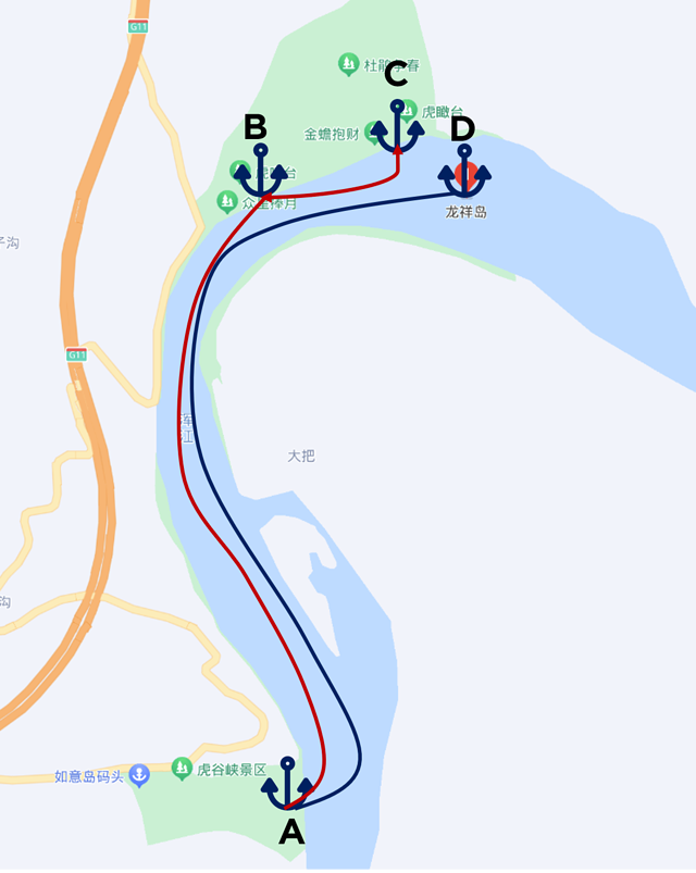 通过和工作人员沟通,由于龙祥岛和虎谷峡属于独立运营的景区,因此游船码头不互通,且不允许对方游船靠岸,所以航线图如下