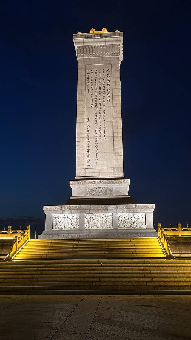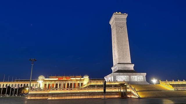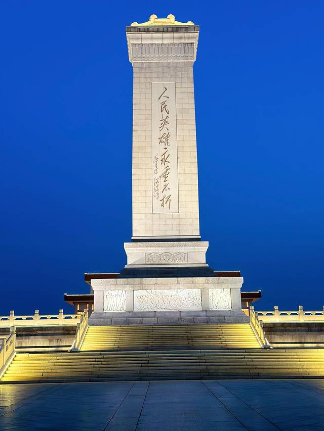 夜幕下的天安门广场灯火辉煌,人民英雄纪念碑更显庄严。碑后的题词发人深省,和平来之不易,吾辈更当自强。