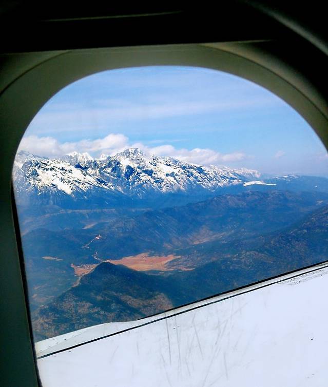 将近4个小时的飞行。看了看航线,是经过 西安 ,然后向南穿过 四川 。飞机上经过的巍峨雪山和蜿蜒的金沙江水。