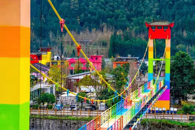 同样以亮眼著称的就是七彩索桥了,鲜艳夺目的桥体如同一条从天而降的彩虹,这也使它成为了金色清平的老“网红”。