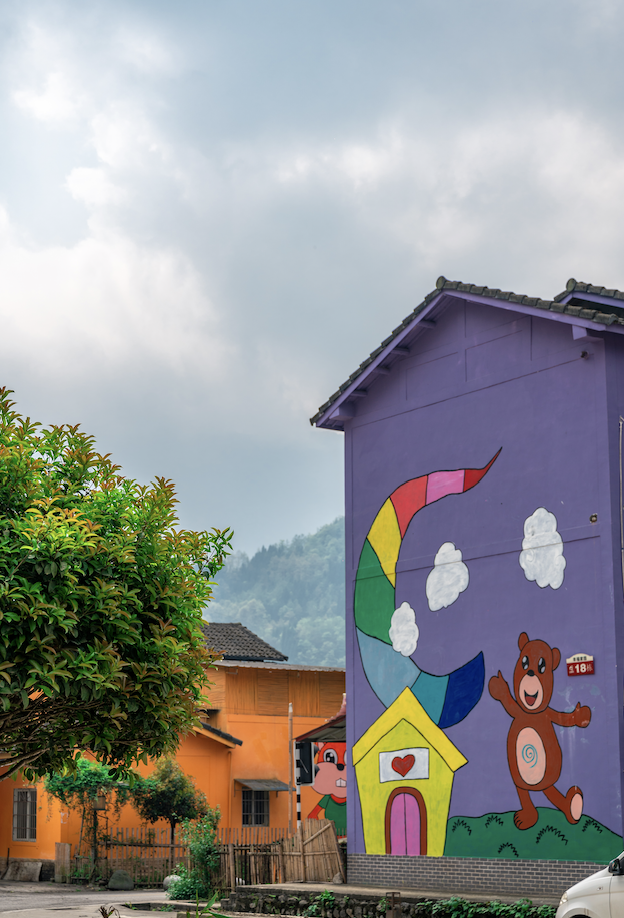 金色清平里最显眼的景观就是那成排成片的七彩房子了,每座房屋都披上了不同的色彩,墙体还画着可爱的动物,鲜艳的颜色宛若童话中的糖果屋。