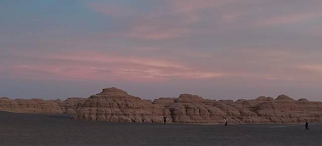 在从玉门关遗址到雅丹魔鬼城路途中,司机大哥说,我们现在实际进入了无人区,除了旅游的车人外不会有其他车了。这一路都可以看到雅丹地貌,最令我惊喜的是快到压单的时候沙土变成了黑色。