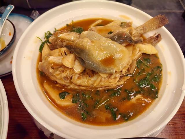 红烧河豚,就是那个司机说的肯定不是河豚的河豚。多鲜美是尝不出来的,上面那个像鱼皮的胶状物内里有凸起的小刺,下面的鱼真的很像我们平时吃的小黄花鱼。