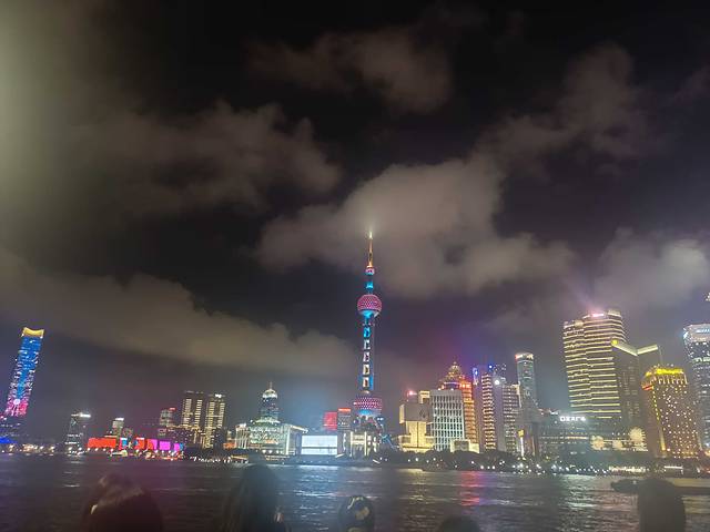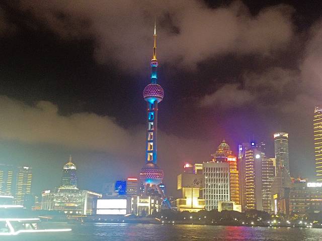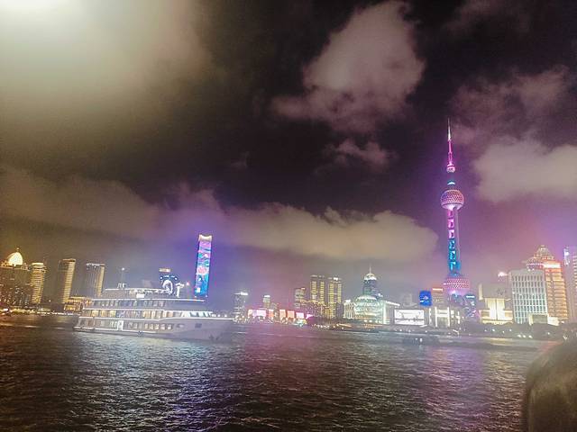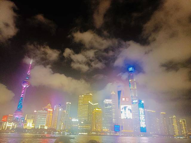 夜晚晴空万里的黄浦江上面映衬着白云,这汹涌的白云,映衬在繁华的东方明珠电视塔上面,然后围绕着周围繁华的上海商务高楼真的再次的把上海这种磅礴的气势渲染出来,夜景非常美丽