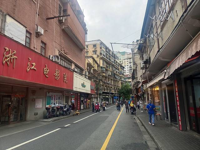 走在这条街上面呢,我首先看到了对面的浙江电影院,这个电影院啊,然后它的这个风格有一点就是像以前的老式电影院,就相当于很多你以前的上海,然后很多很多的年轻人或者是中老年人都会自己在这里看电影的那种电影院啊,就是很老式的那种我觉得有一种老上海的感觉