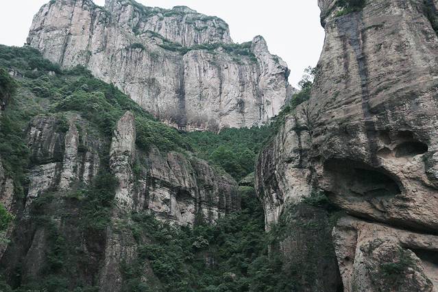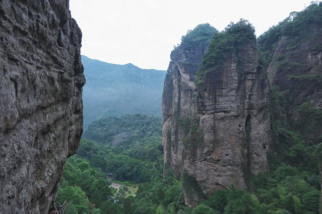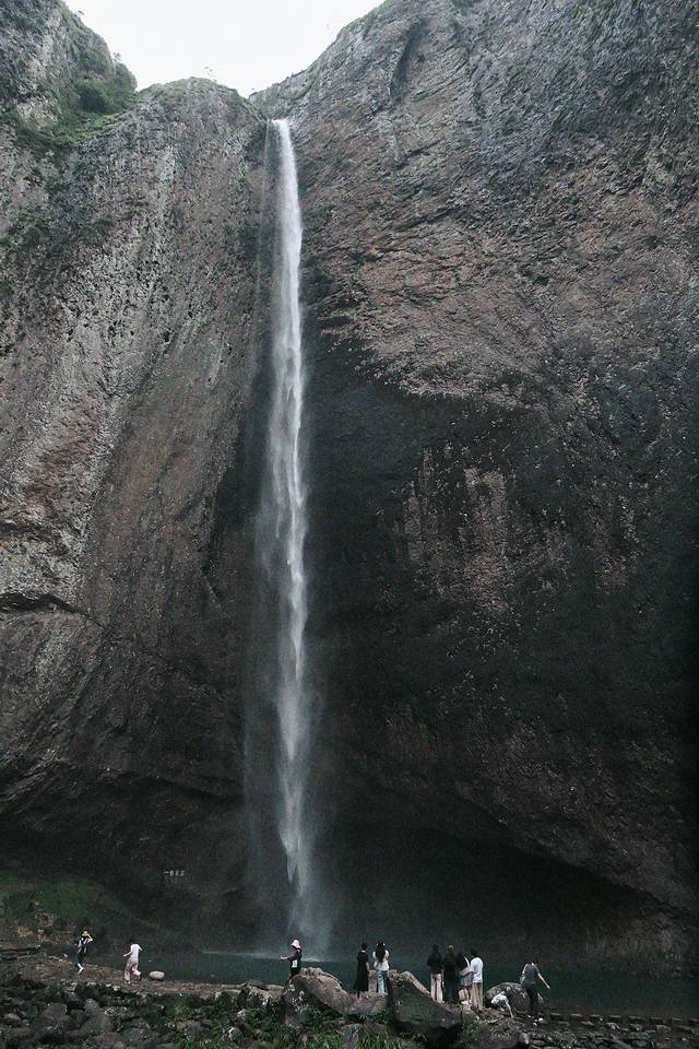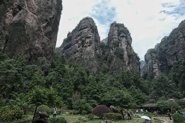 大龙湫:雁荡山既有飞瀑、流泉,还有如镜的碧潭,宁謐的溪流,大龙湫景区当是集合了峰、嶂、瀑、溪之大成,山水自然,堪称雁荡山一绝。进入景区后我们沿锦溪徒步而行,剪刀峰,一景多变。穿过一小段密林,大龙湫赫然出现,因刚下过雨的原因,瀑布流水非常之大,从高197米的高壁悬崖飞流而下,当有“疑是银河落九天”的气势,不愧为雁荡山三绝之一。巨石四周郁郁葱葱,我们站在这悬崖谷底,瀑雷声声,水花四溅,就让我们在这里接受大自然的洗礼吧。