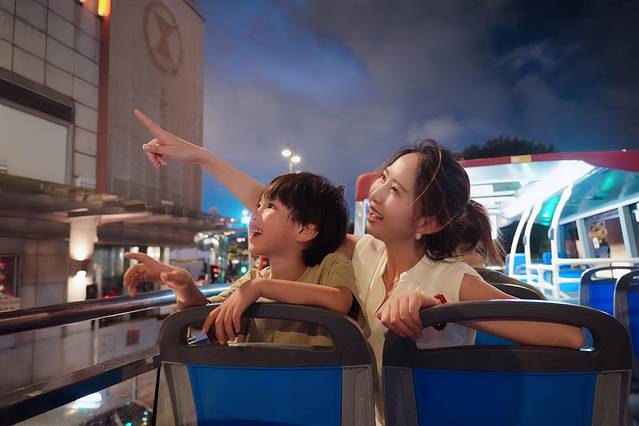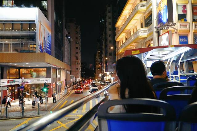 因为住在铜锣湾,所以我们选择了离我们更近的中环码头,搭乘参照传统人力车设计的敞篷双层巴士,夜游香港。