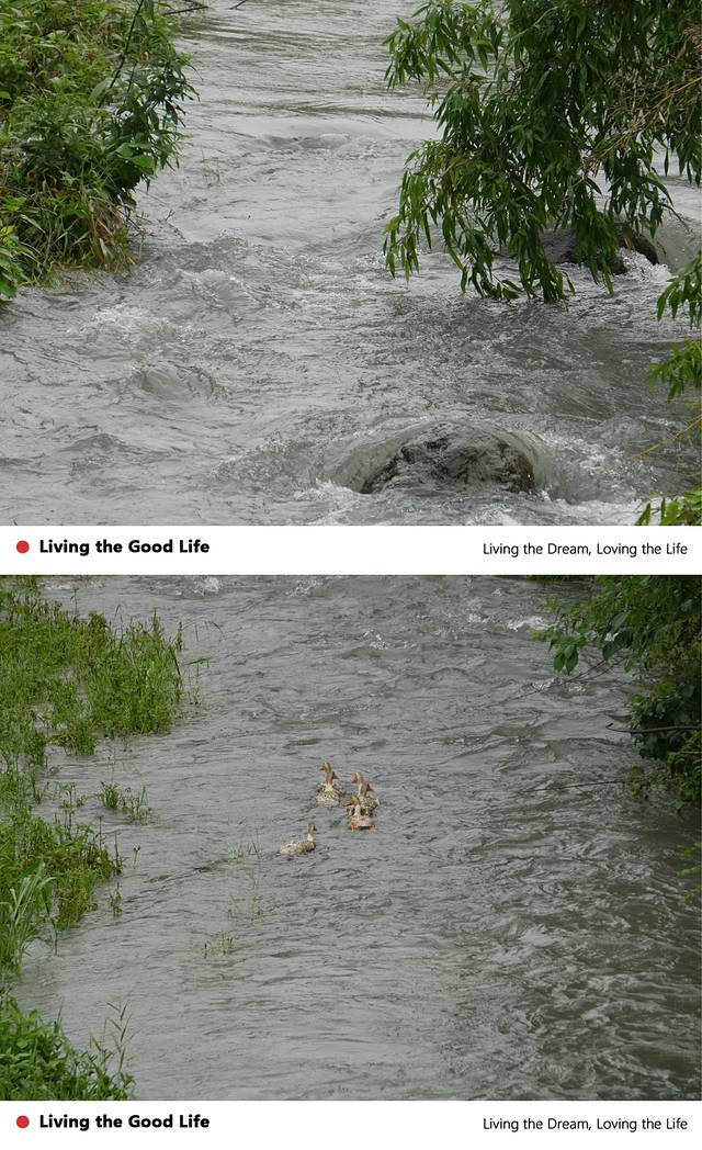 路过一座小桥,看到不远处一群小鸭游过,这在城市里很少能见到的。