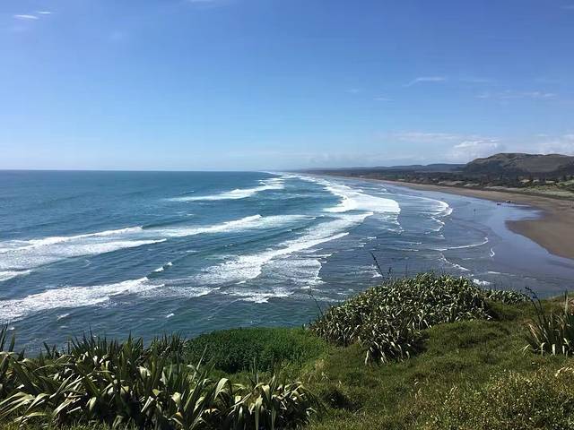 黑沙滩(Muriwai Beach )的闻名遐迩在于它有着得天独厚的铁矿,所以沙滩是非常特别的黑色,阳光的照耀下黑沙特别闪烁耀眼,很漂亮。隔海相望的就是澳大利亚,海浪很大,气势磅礴,近距离站在礁石上看着海浪的拍打,视觉和感受上都是挺震撼的,并有冲浪爱好者在这儿冲浪。