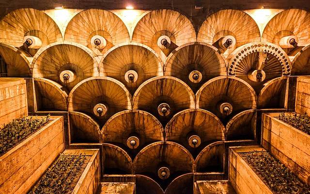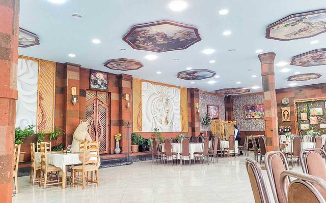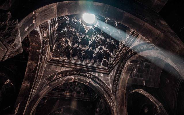 雕刻了繁复花纹的穹顶,如同花瓣般散开,教堂由几根粗大而古老的 石柱 托起,光线透过屋顶和窗户投射进来,内部略阴暗,配合摇晃的烛光,充满古老庄严与肃穆的感觉。