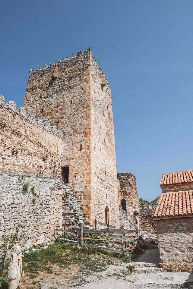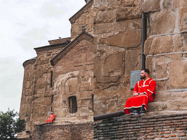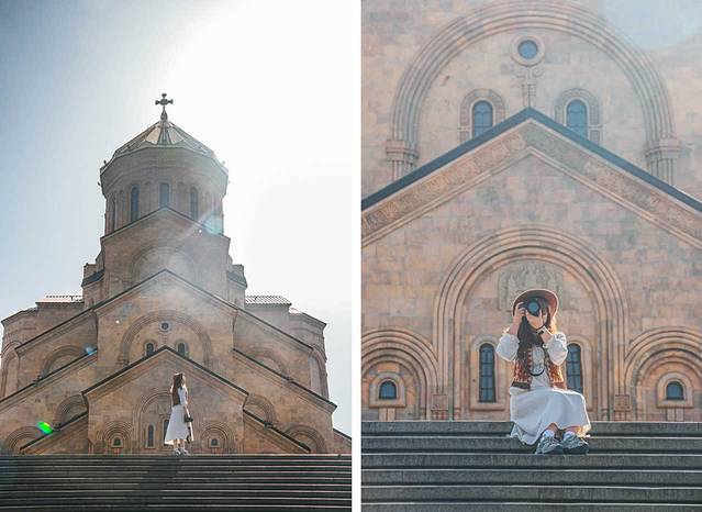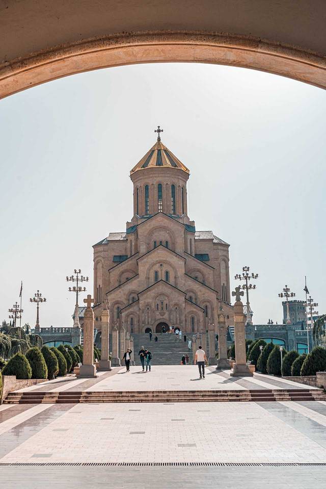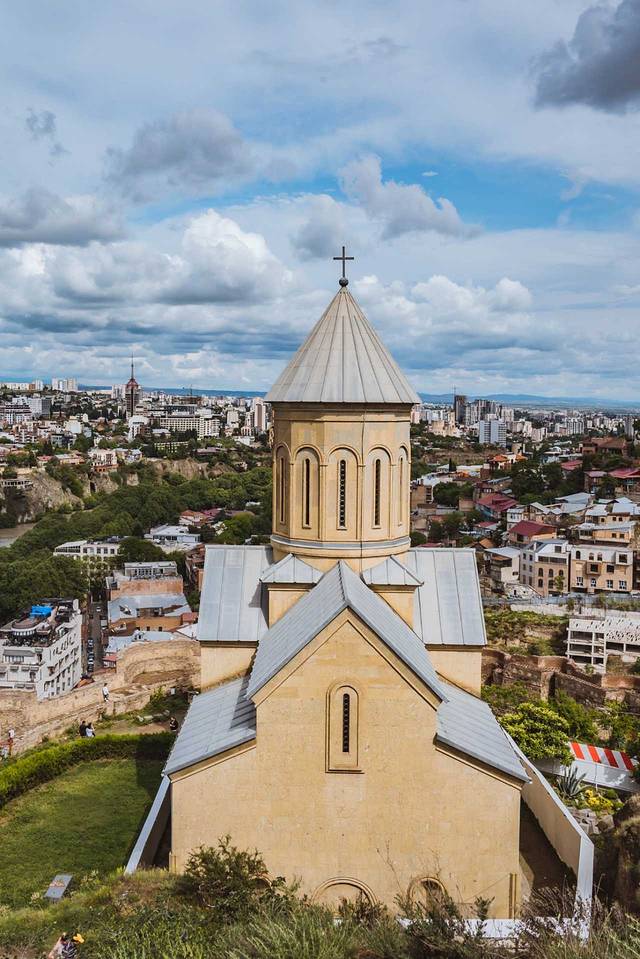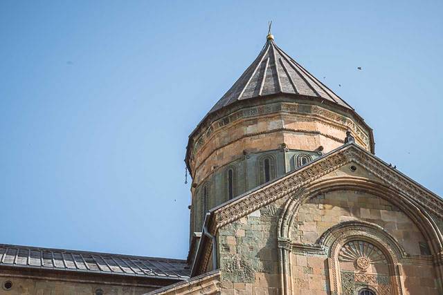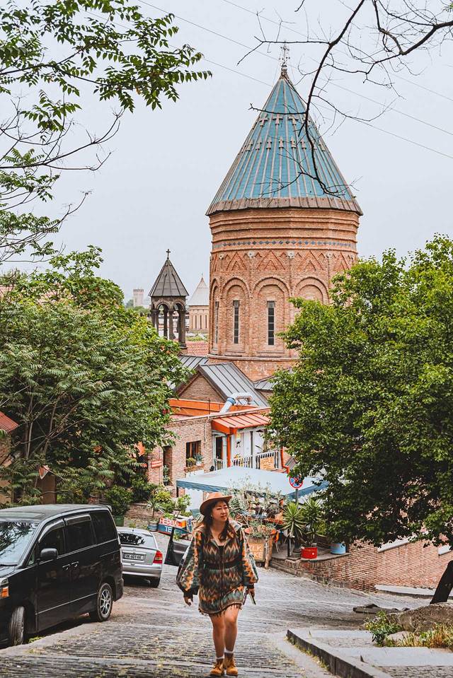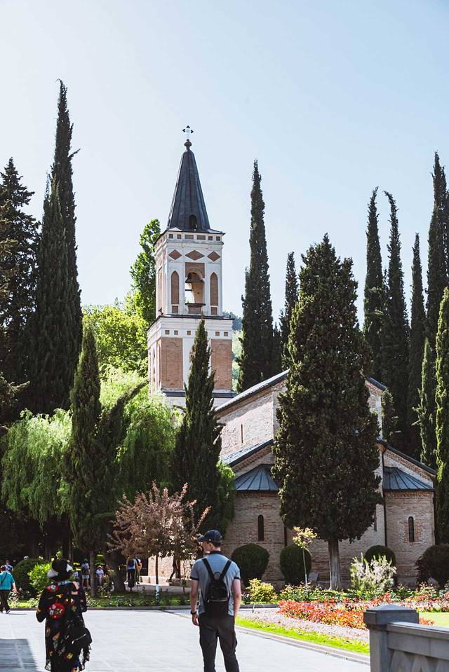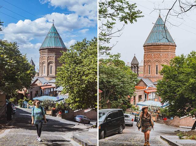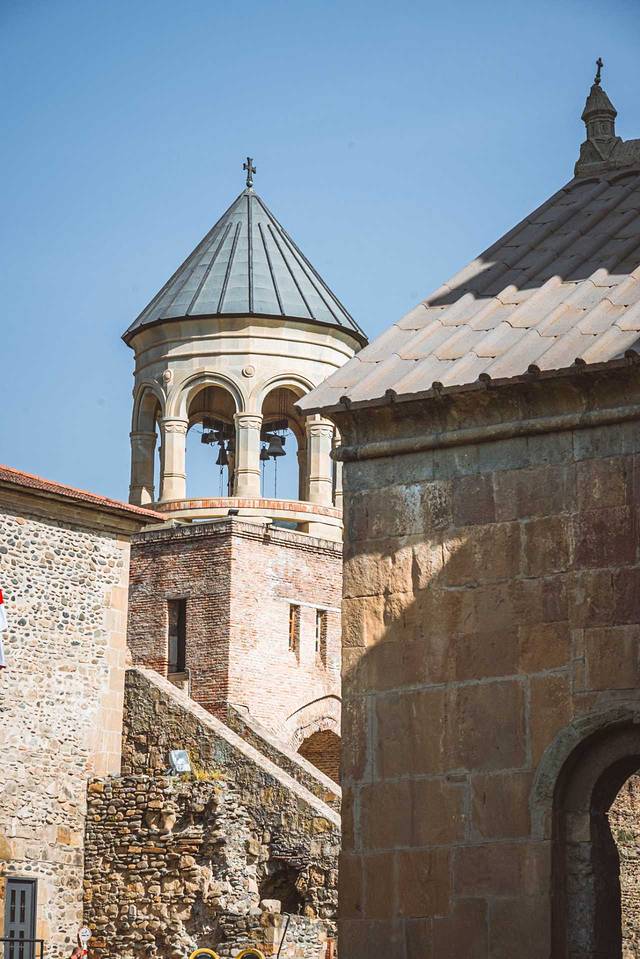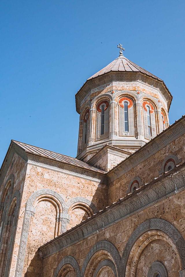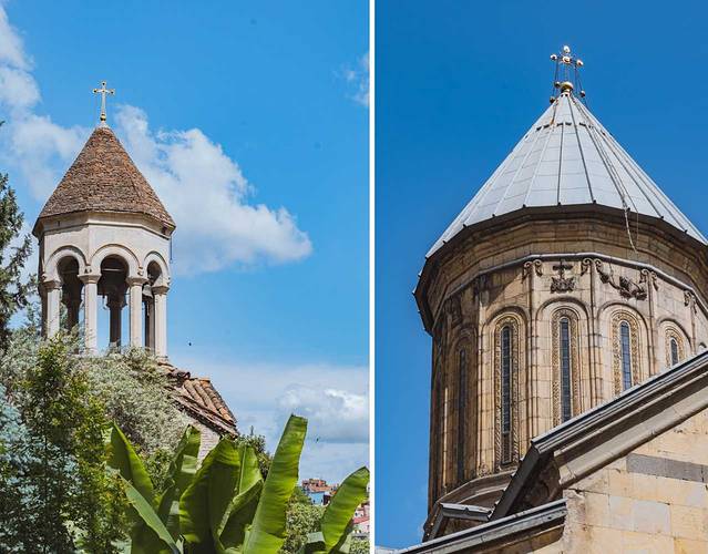 路过这座老城区内的教堂,始建于公元6~7世纪,目前看到的外观是13世纪 格鲁吉亚 “黄金时代”的重建版本,它使用的是黄色凝灰岩石材,跟梅特希教堂有相似的外观和结构,其东面的三个半圆式壁龛同样突破了东墙的竖直限制,这种外观结构是 格鲁吉亚 中世纪教堂的经典样板。