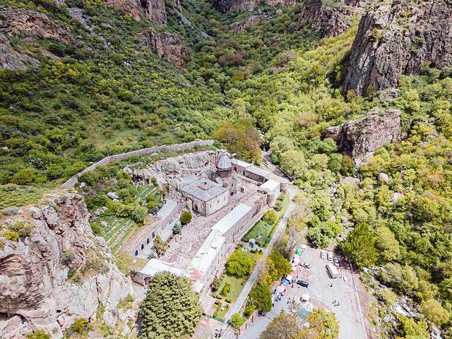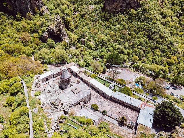 它处在峡谷的深处,geghard意为“圣矛”,指的是传说中耶稣上十字架以前, 罗马 士兵用来刺过耶稣身体的矛。现存的岩中修道院建筑年代是公元13世纪,修道院全部建筑都是从山岩中开凿出来的。