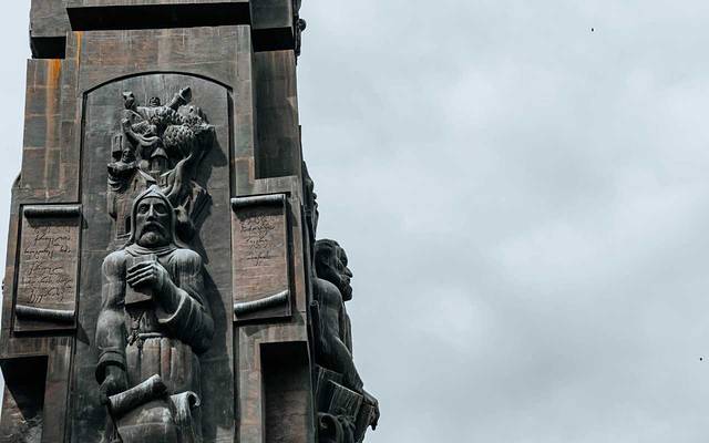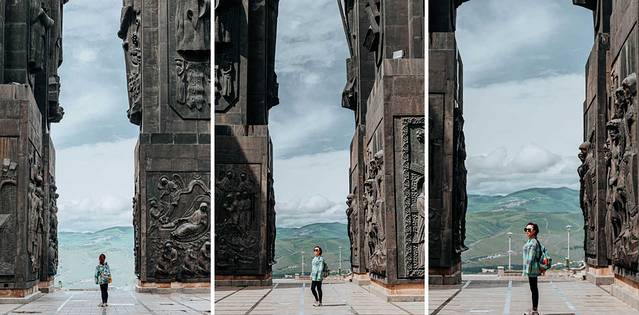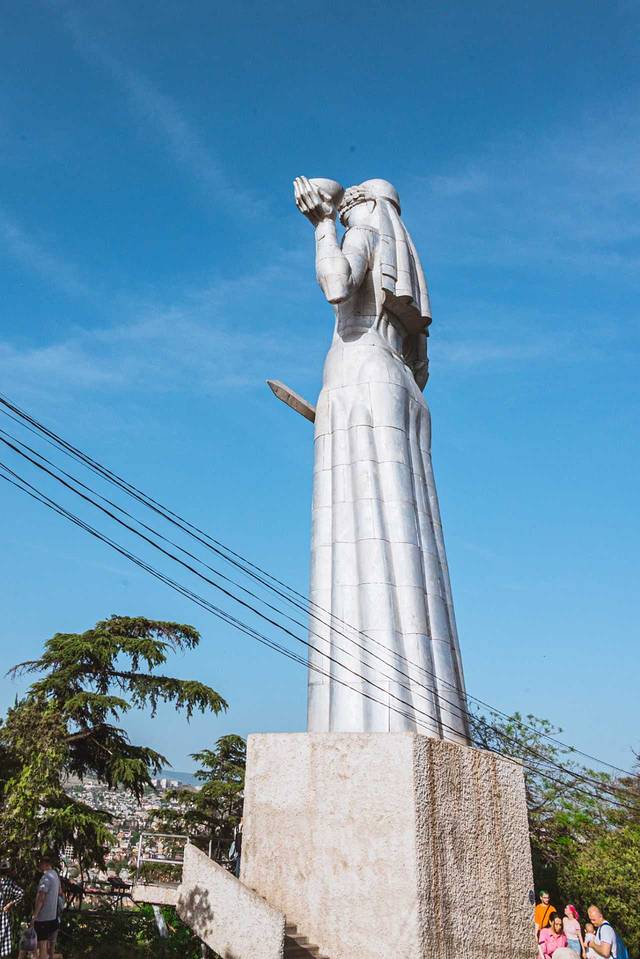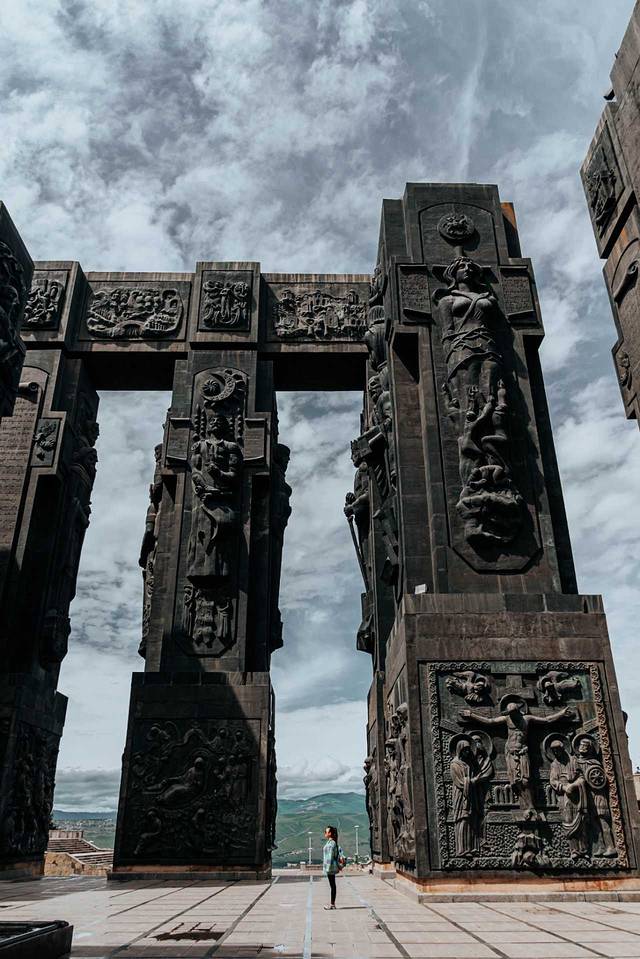 高35米的青铜柱子伫立在广场之上,柱子上半部分的浮雕人物都是 格鲁吉亚 历史上的名人,包括圣人、国王、诗人和军人。而下半部分是圣经里的人物和场景。巨大的柱子,显得人非常的渺小