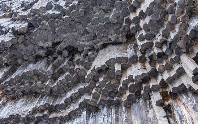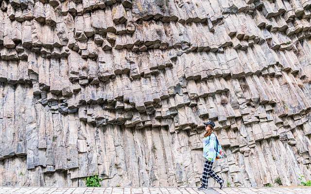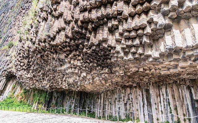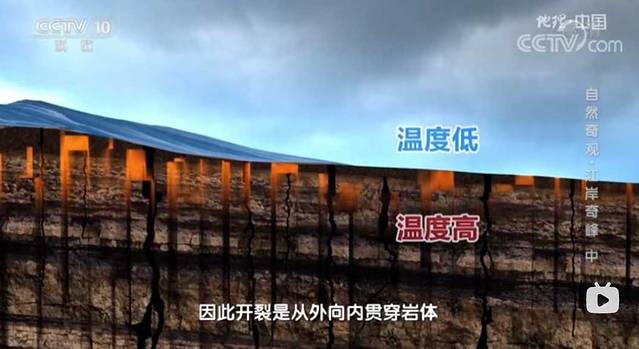 柱状节理是岩浆冷却形成的,随着温度下降,熔岩的体积开始收缩、开裂,由于外界温度低,岩浆内部温度高,因此开裂是从外向内贯穿岩体,这便形成了壮观的 石柱 群