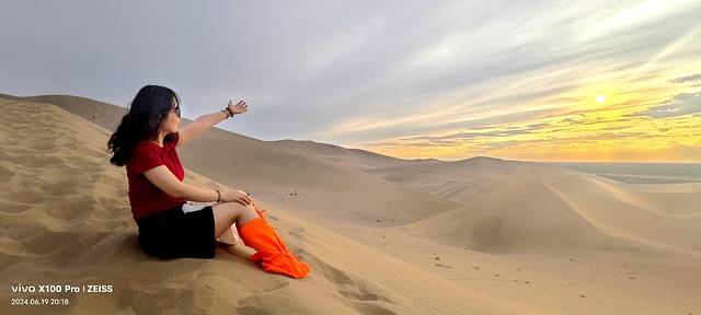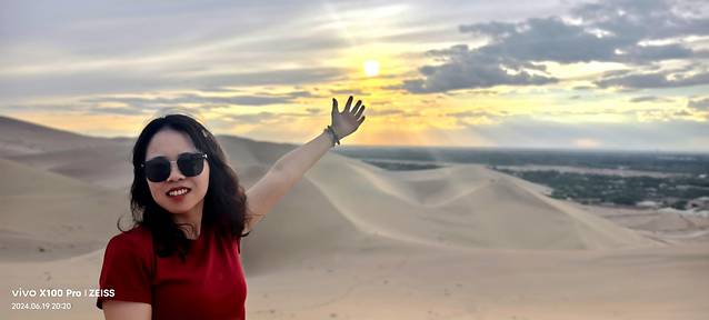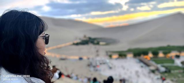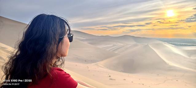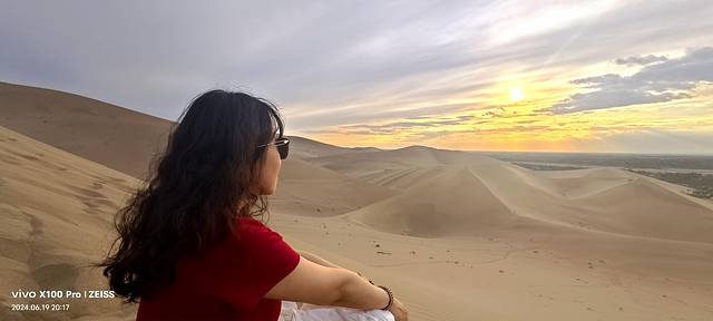 整个骆驼骑行还是比较好玩的,来到鸣沙山还是要体验一下。骑骆驼的过程中我们去体验了一下滑沙。在爬山的过程中我们看到了日落,运气真的好。
