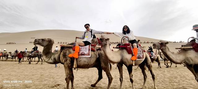 到了鸣沙山顺利进入景区,我媳妇没有骑过骆驼,所以这次她要骑骆驼,我本来因为腰有伤不想陪她骑,但是她一个人又不放心,最后陪她一起骑。