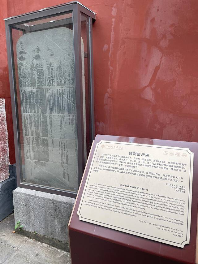文武方门是孝陵的正门,原为5个门洞,3大2小,中间3个为拱形门洞,两边2个为长方形门洞。庑殿顶上盖黄色琉璃瓦。清朝同治年间改建为一个门洞,上嵌清石门额,阴刻楷书"明孝陵"3字。1999年重新进行修复,恢复了明代时大门的原貌。现为五门,黄瓦、朱门、红墙,正门上方悬挂长方形门额,竖书"文武方门"4个鎏金大字。正门东侧立有一块"特别告示"碑,此碑是清宣统元年(1909)所立,以六国文字书写,警示保护孝陵的注意事项。碑亭后原建有两御亭,西边叫宰牲亭,东边的称具服殿。