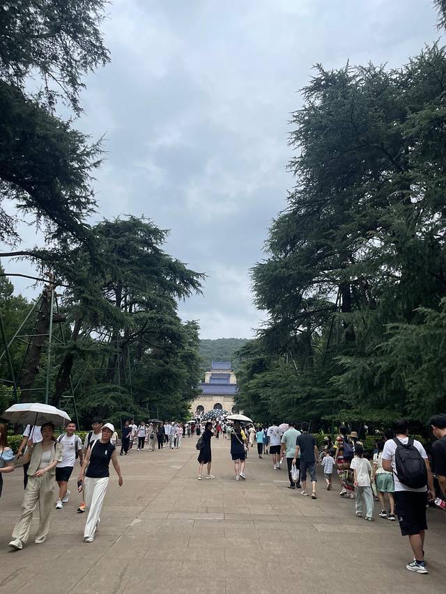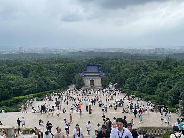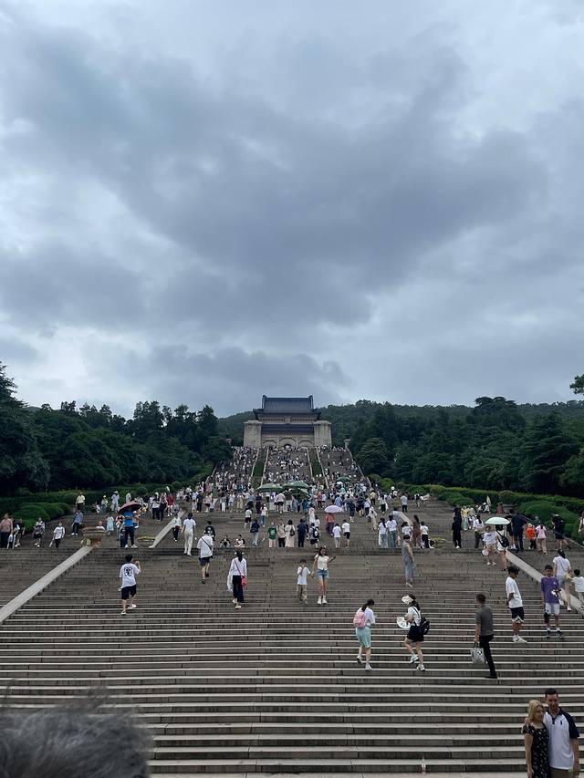 台阶中段放着一口大鼎是奉安大典南京政府捐给中山陵的,上面的一个流弹炸的坑也见证了曾今日军的侵华战争。这片地也是诸葛亮和毛爷爷口中的虎踞龙盘之地,不愧是风水宝地。