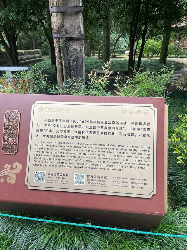 碑殿中石碑上书「治隆唐宋」四个鎏金大字,碑高3.85米,宽1.42米,厚度0.38米。「治隆唐宋」的意思是颂扬明太祖治国方略超过了唐太宗李世民和宋太祖赵匡胤。这是清康熙皇帝1699年第三次下江南谒陵时御题。这是因清朝刚统治中国,康熙执政初,汉人不服满人统治,在这样的历史背景下,康熙深知,光靠高压政策是不行的,还须依靠汉人。所以,康熙在6次南巡中,5次拜谒明孝陵。此碑由曹雪芹的祖父、当时的"江宁织造"郎中曹寅刻立。在"治隆唐宋"碑左右还有清朝乾隆皇帝诗碑各一块,东西有卧碑两块,东边一块刻载康熙帝第一次谒陵纪事,西边一块刻记康熙帝第三次谒陵情形。