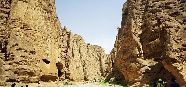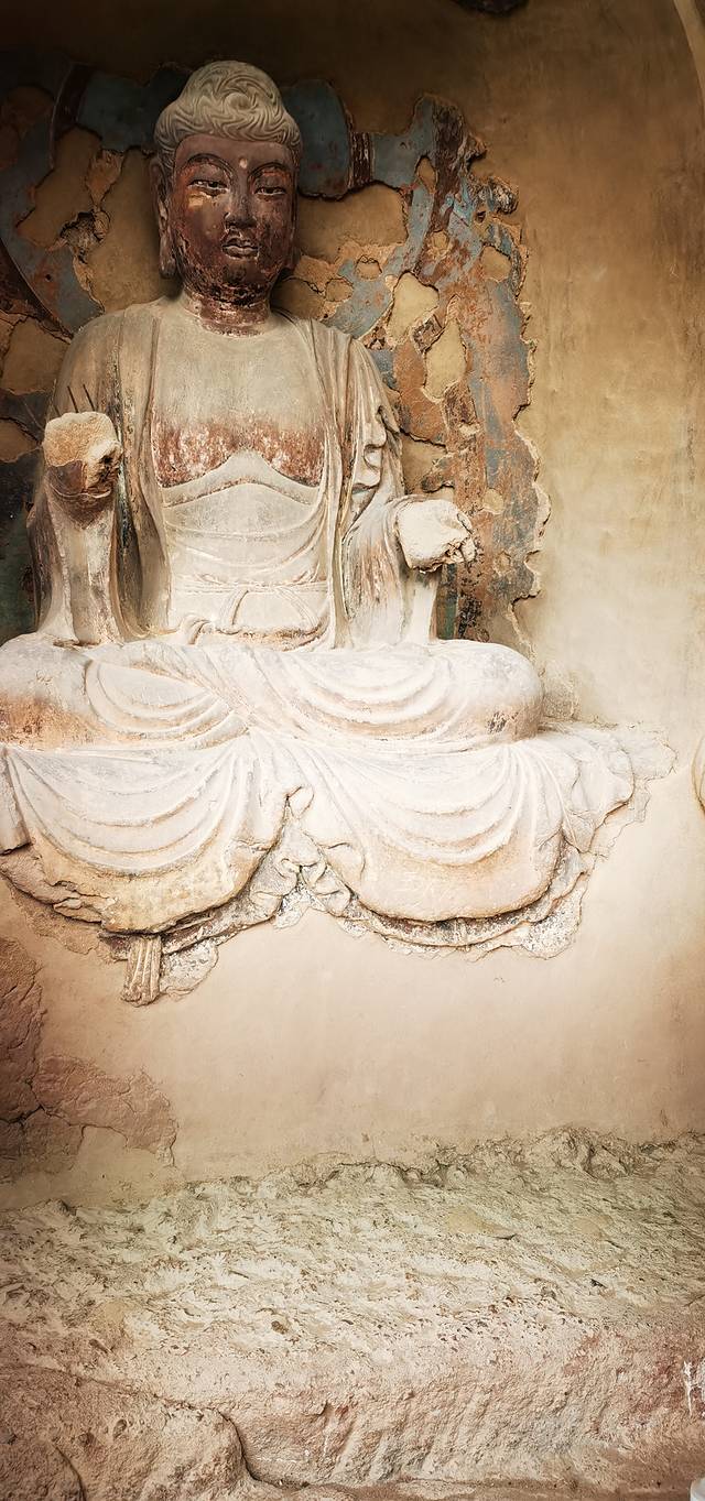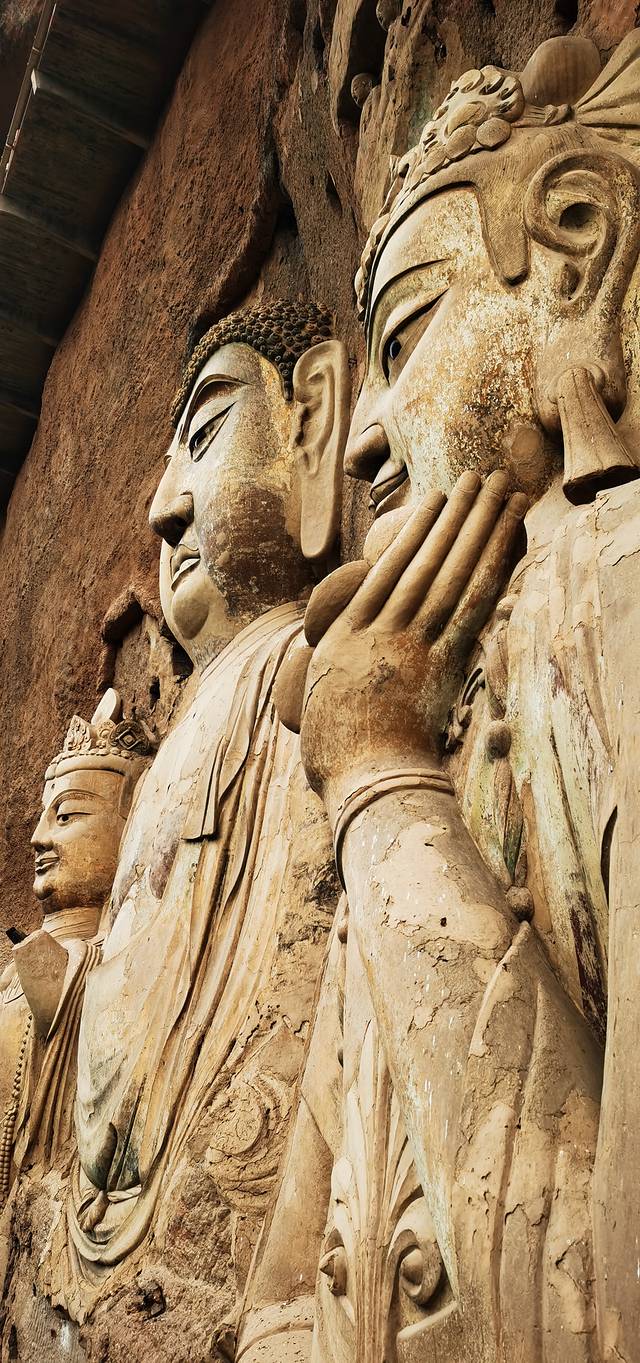 戴导花白的头发,精神矍铄,腿脚利落,说话底气十足。我们努力跟上他的步伐,追的气喘吁吁也跟不上。他解释为什么要快,一会队伍能排到大门口去,会影响大家的游玩时间,让大家先不要拍照,最后他会给大家指点哪里拍照好看。大家追着他的步伐,顺利的蹬上了参观石窟的小窄栈道