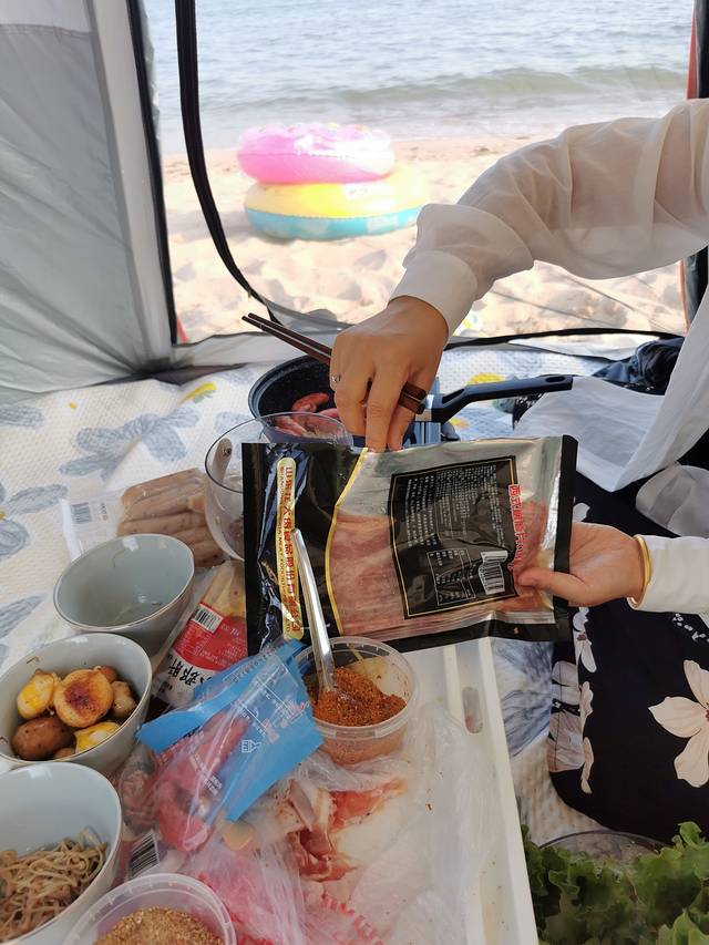 海边搭建帐篷⛺自己煎肉吃,烤肉吃,没有人管!真的很开心!
