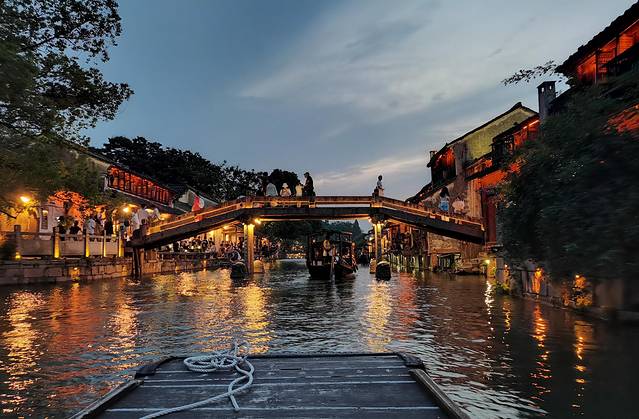 看着桥上、岸上人熙熙攘攘,在悠悠的水道中我们穿桥而过,河面上倒影者两岸的房屋和灯光,如诗如画。