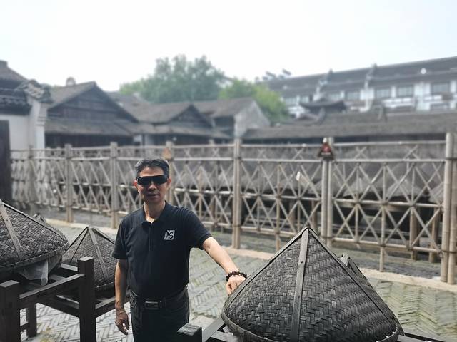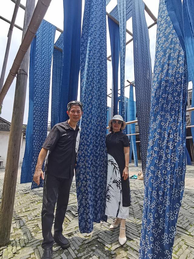 宏源泰染坊,这里是蓝印花布的制作基地,展示了传统的染布技艺,蓝色布条高高悬挂,微风浮动,是东栅景点里比较出片的打卡点,拍照拍视频都很美。