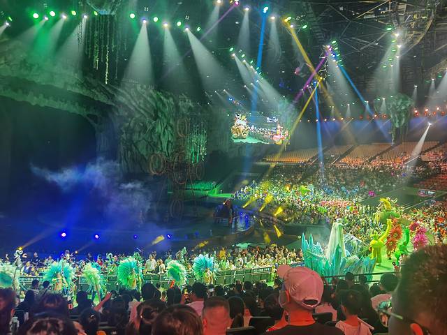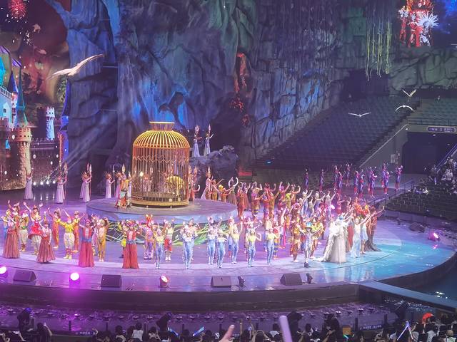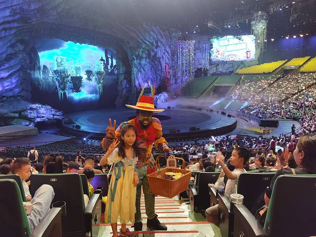 提前一个多小时进场的,已经没有好位置了,在后排,有表演人员卖爆米花,这位叔叔非常友好,和娃合影也很配合,赞!