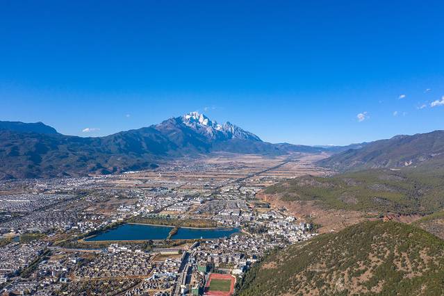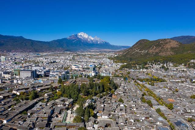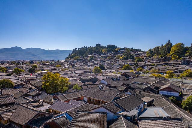 丽江 古城整体没有高楼,远处山端的 狮子 楼占据了制高点,因为限飞,古城限高120米。
