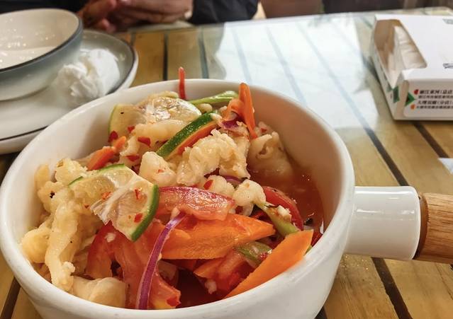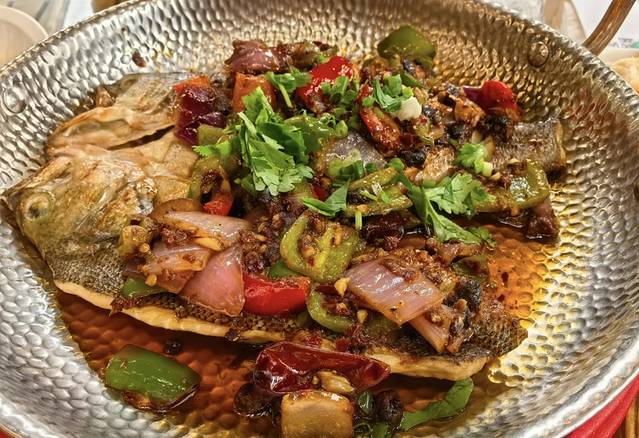 东巴烤鱼超出预期。选用鲈鱼烤制,不错的选择,烤好的鱼淋上汁水后,一点鱼腥味都没我亩,加强调料,真的很不错,非常推荐。