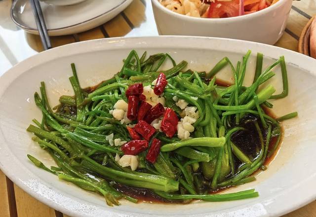 说起菜品,可谓是喜上加喜。首先要推荐的是炝拌水性杨花,这道野菜真的是让人惊艳不已。它采用了有点类似广东白灼的烹饪方式,保留了食材原本的鲜嫩口感。炝锅辣子和蒜泥恰到好处地淋在菜上,入口时,那滑嫩、脆爽的感觉瞬间在舌尖绽放,新鲜的味道仿佛让人感受到了大自然的馈赠,毫无疑问可以给到五星好评。