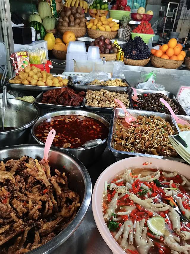 抖音搜索了当地的特色小吃,出发前往,把车停好后,一路走过去,有特色的小店里坐坐,休闲一会;咖啡店里听听歌,给小朋友喝个饮料放松。一路走下来到下午才到小吃店,想吃的全都安排上,此时吃小吃大排档真是太满足了,拌水果、泡鸡脚、油炸拌菜、小卷粉、卤味、舂鸡脚、撒撇、泡鲁达、、、、、、满足了一个吃货的胃。