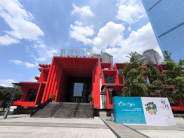 重庆美术馆外形很有科技感,红黑配色有较重的神秘色彩,外型有类似于叠方块式建筑。