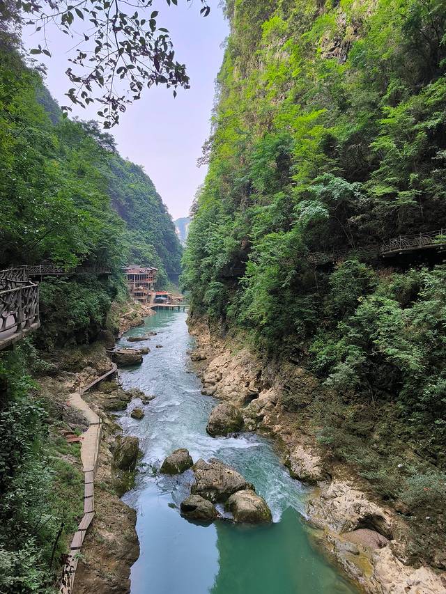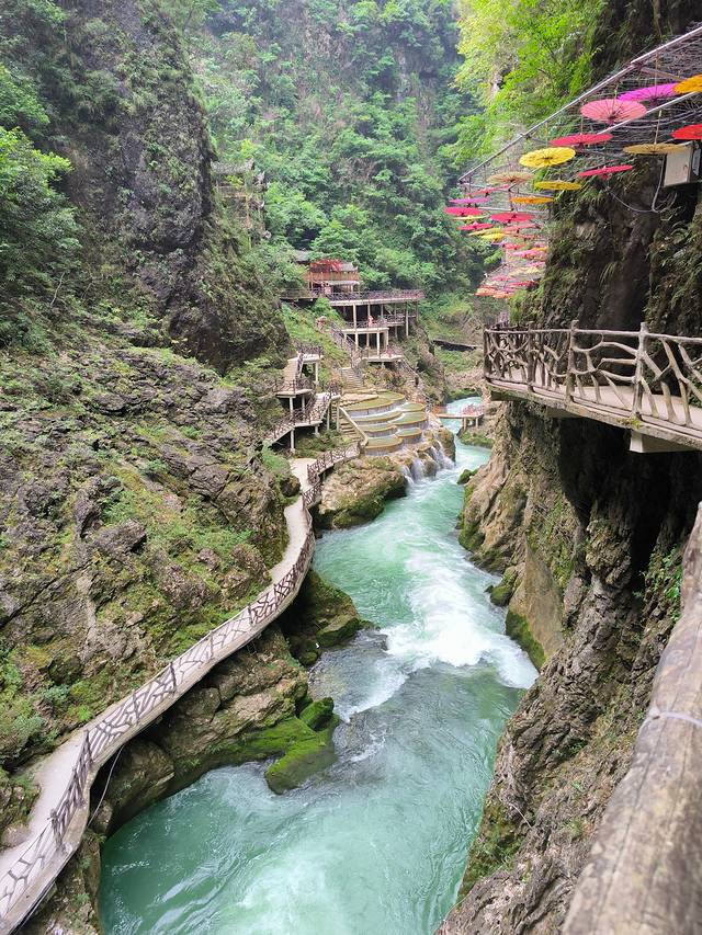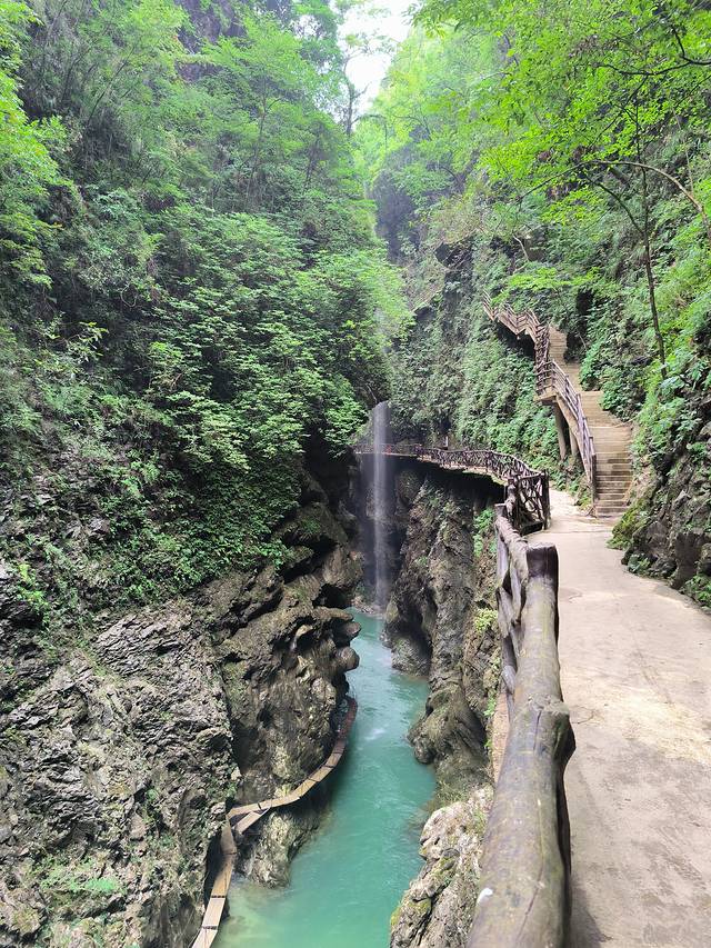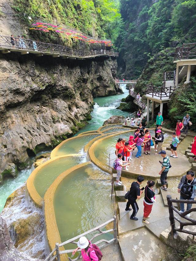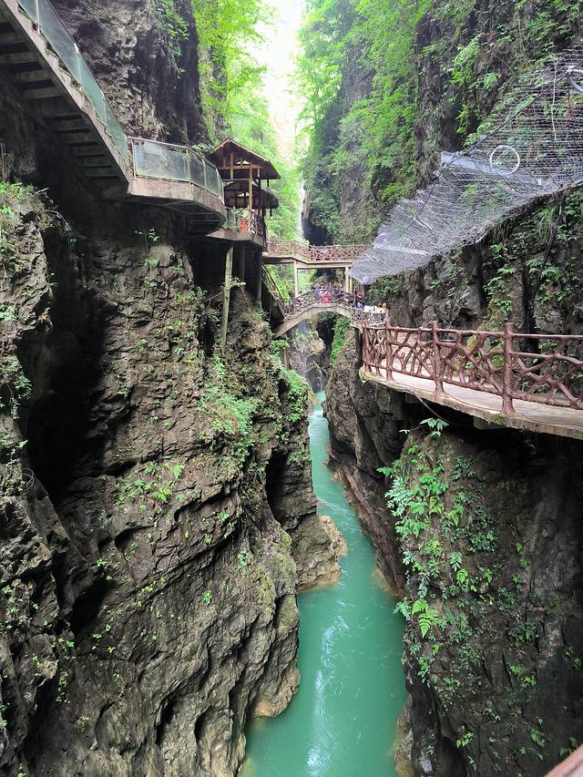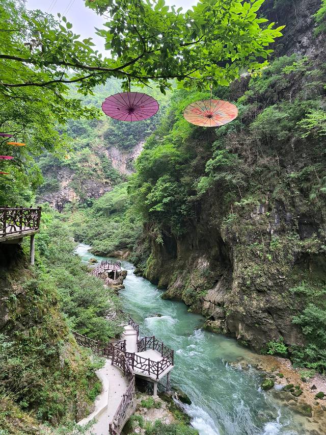 铜仁-铜仁大峡谷,42公里。铜仁大峡谷是个网红景点,不在A级景区的范围,基础设施相对落后,游玩体验并不好,关键是门票价格120确实太贵了,不值。峡谷在这茫茫群山之中,在高差数百米的万丈群峰的夹峙下,两岸河谷幽深,泉瀑飞泻,崖树斜逸,异草遍被。景物特色可用“峻、隐、幽、旷、奇、险”六个字来概括。峡谷漂流是凤凰周边最刺激的漂流。集瀑布、深潭、奇石、丛林、珍稀植物于一体,悬崖对峙、奇峰耸立、滩多水急,银瀑飞溅,人随艇飞,移步换景,自然景色之美令人为之震撼。赋予了铜仁大峡谷漂流与众不同的特色。