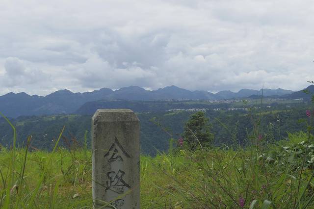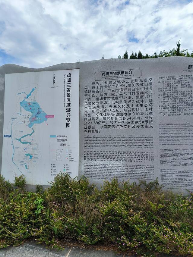 爬到1996年由毕节地委、行署立的“鸡鸣三省”纪念碑前,碑为三面碑,象征三省,碑名由萧克将军题写,碑座60厘米,碑高352厘米,站在岔河边的四川境内方能看到红红的碑色。所谓的鸡鸣三省指的是贵州的银丰村、四川的岔河村、云南的德龙村(音)。