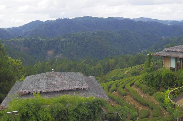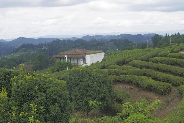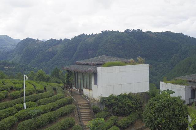 走进独山县影山镇茶天堂看见,一栋栋玻璃房被群山环抱、茶香簇拥,在阳光的影射下显得格外闪耀,屋顶上一排红花与茅草顶盖交相辉映,白色的落地窗帘犹如少女的面纱,透着丝丝神秘。