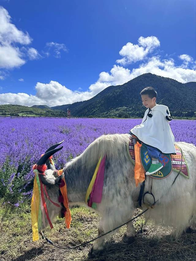 儿子第一次骑牦牛,成片的薰衣草配上白色的牦牛也很应景。