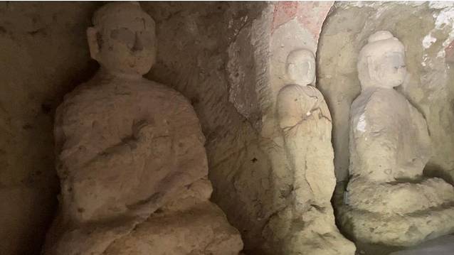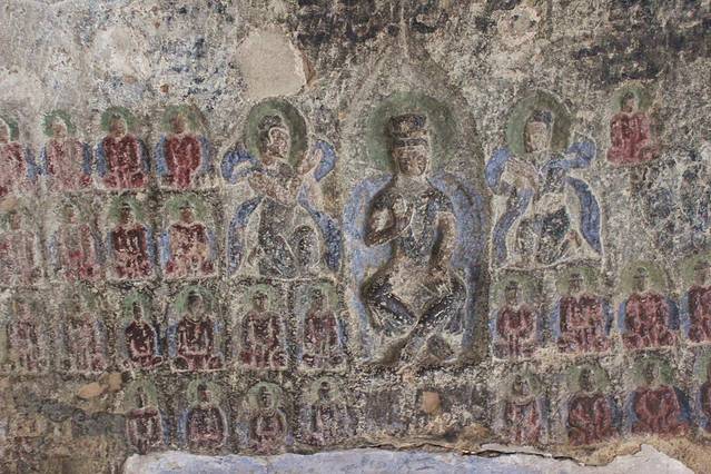 眼前这个低矮的洞窟。是第2,3,4窟,损毁比较严重。石壁上有一些小型 菩萨 像和飞天。这些小佛像,每个不过巴掌大小,整整齐齐的雕刻在石壁上。万佛堂的最大好处,就是可以近距离观察这些古老的遗迹。只有在这样不太著名的石窟里,才能如此近距离的看到墙壁上的五彩飞天伎乐。