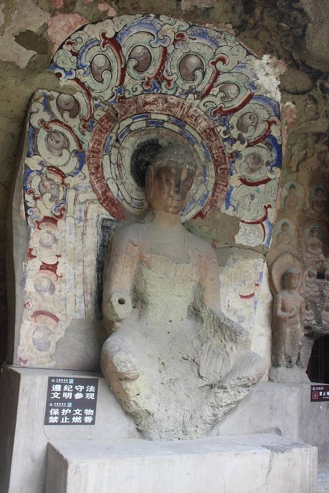 交脚弥勒是万佛堂保存最完整也最值得观赏的一尊佛像了。也是体量最大的造像,高3.5米,是北方石窟中最大最早的一尊弥勒佛像。